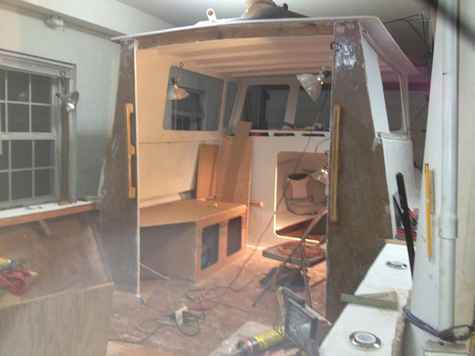 She has a 3 ½ anchor deck, 7 foot cabin with two bunks, 6 foot pilot house with a bench seat with slip top for standing at the windows. She has fully opening lexan windows on a 45 inch opening, which I made so I can drive hook my arm out the window at the right height, 6'2" pilot house height max, nine separate compartments for safety and beach sand in the final coat of epoxy for non skid prior to painting.