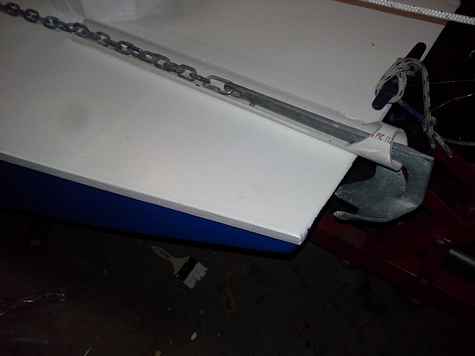 Small anchor in bow roller made from PVC.