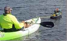 Paul's forty pound tugboat has enough power to pull him against a head wind. This may be a new use for radio controlled boats.