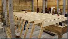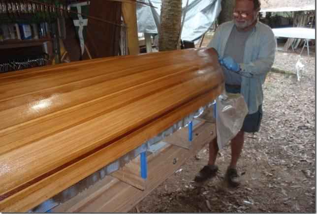 Layer of glass going on. Sandy's using cypress for the wood on the boats instead of the usual cedar. It's a little heaver, not much but easier to work with and costs a lot less.