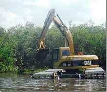 Speaking of Michelle, check out this machine crew she's working with. They need to dig a trench through a marsh for the dredger to go through and this is what they are using. Have you ever seen anything like this, a floating tracked digger.