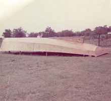 The plans call for a hull 36 feet long and 10 feet wide, ours ended up 37 by 10 with a three foot long bowsprit. We didn't have much money so we built the boat light and cheap 2X6 frames and half inch plywood and a very simple interior and no systems of any kind. The only through hull fitting was one drain for the cockpit. Covered the whole thing with fiberglass mat and polyester resin. A big investment was 2000 pounds of steel punches for ballast.