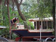 Someone was finally smart enough to buy the best 16 foot Melonseed ever built. This is the one with the foam hull that is indestructible. Here you see me and Laylah trying to sink it. It's mast was a little to fat so Fland's taking it down to the proper size, three inches at the bottom and two at the top. He's going to have so much fun with this one; I can see him surfing it in on Jacksonville Beach.
