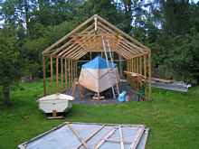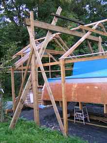 The boat shed would have to be strengthened to take the weight, I may not be very bright with the welding but wood I do understand and being trained as a software engineer helps to organise and schedule the solution. Firstly, the polythene roof will need to be rolled back at the ends, or taken off to avoid damage. I can put it back on later, when the job is done, for the next phase of boatbuilding, till the wheelhouse gets too tall and I have to make adjustments. The next question I think should be. How can I lift the boat’s weight and turn the hull?