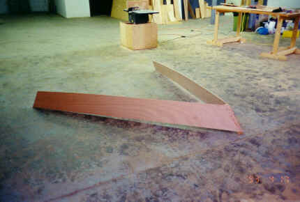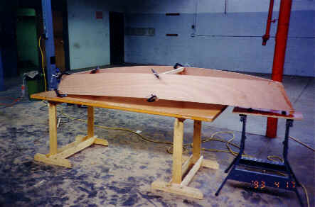 6) Cut 1x2 as shown on drawings and install chine logs. (If you have splitting problems thin them down an eighth of an inch.) Use washers on your screws on the ends and at the main frame to stop splitting as this is about as much of a bend as you can make in a stick of wood without steaming it.