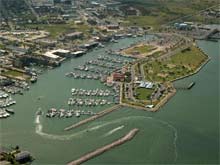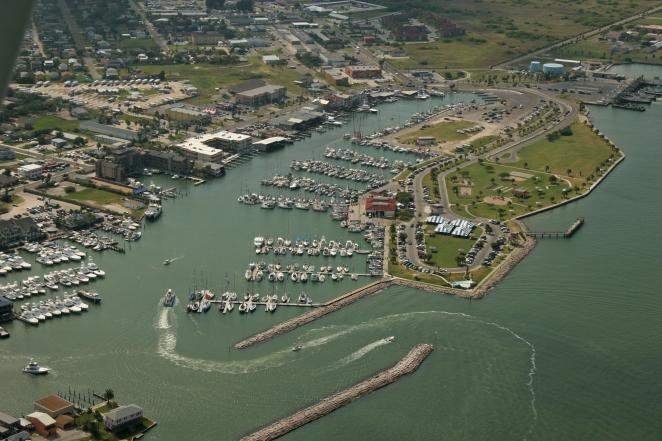 Aerial view of the Port Aransas Marina. The grassy area on the right is where we will display boats in addition to those in the harbor. |