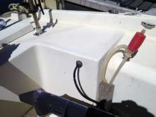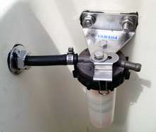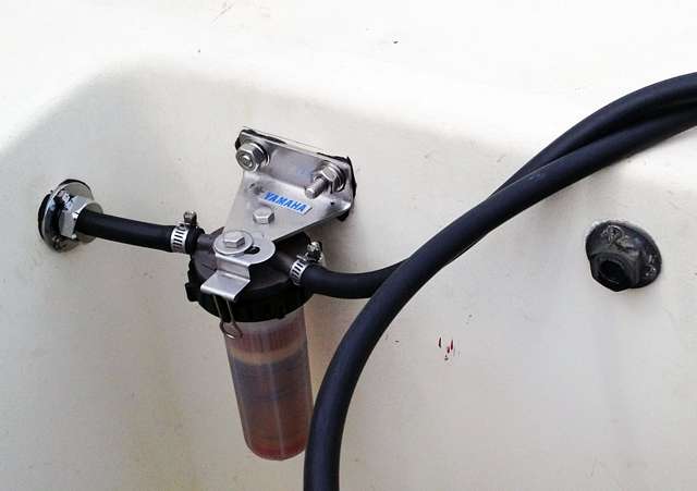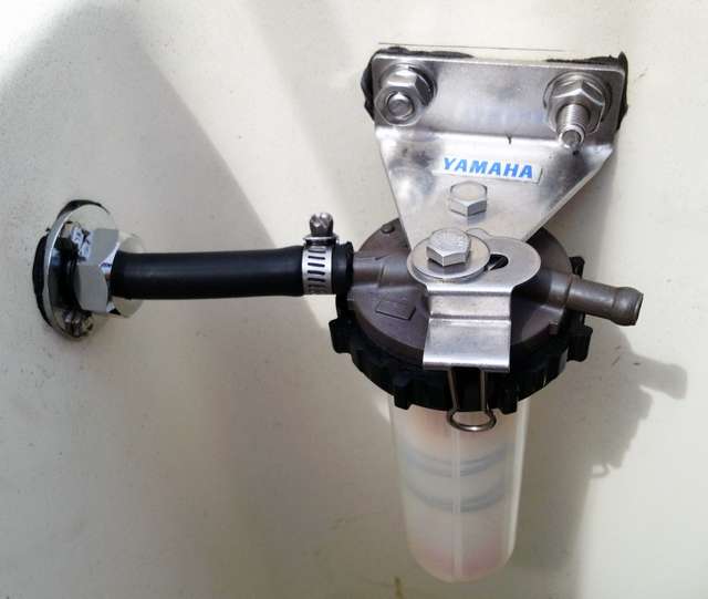 I bought a Yamaha fuel filter and thought it would be rather straight forward to fit it on the port side of the outboard well so the fuel line could exit the stern bulkhead, go through the filter, and hitch to the outboard.