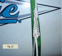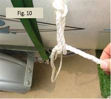 Fig. 10 shows the first stage of forming the modified garda hitch. The working end is led from the bowline knot down around the trailer and then back up to the bowline knot to be fed through both rope loops. Our plan to complete the garda htich is as follows. Before leading the working end back down to the trailer a second time to be tied off as occurs in a conventional truckers hitch, we’ll first feed and wrap the line through the bowline one more time. But instead of feeding through both loops as shown in Fig. 10, the second time we’ll bring the working end down between the two bowline loops as shown in Fig. 11.