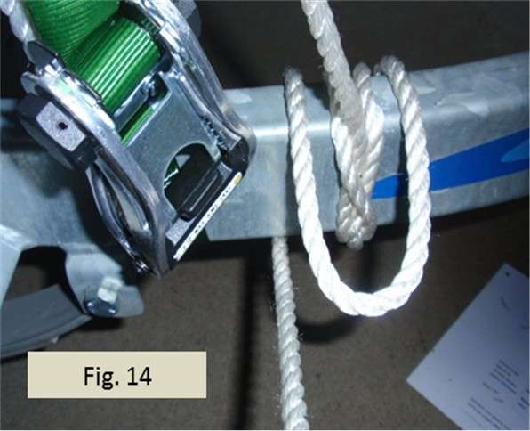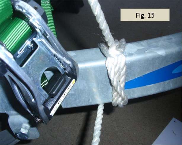 Fig. 14 shows the first step to make the clove hitch tighter and more secure. First, I take the tail coming out of the clove hitch (the tail is hanging down in Fig. 13) and feed it under the trailer beam and then back over the top toward me on the right side of the pulling line that comes down from the ratchet knot. Next, I take the end I am holding and feed it over the top of the trailer beam on the left side of the standing part. I let the tail drop behind the trailer beam so I can reach under and grab the line and pull it back toward me from under the trailer. In effect, I’m forming a rope collar around the standing part. This is a “collar lashing” that when pulled makes the line coming down from the ratchet knot much tighter.