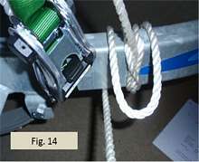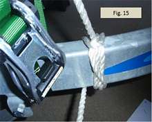 In Fig. 12 I’ve pulled the line over the cargo very tight using the ratchet and pulley action. I’m not holding the pulling line, but the ratchet effect holds everything over the cargo in tension. The tail of the pulling line coming out of the ratchet knot is still slack, though, because I have not yet tied it off. I now need to tie off the end of the pulling line tautly to the trailer so that the ratchet knot cannot release and the tension is secured. Note that the part of the line holding the cargo is already fully tensioned. We’re not making that part of the line tighter at this stage. We’re just securing and tightening the tail end of the pulling line so the ratchet can’t come undone and release the cargo tension.