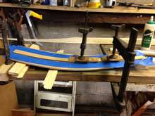 A trial layup (see below) found that the loom was not tight up against the blade about 6" from the end of the loom. Using a pair of wedges, I was able to force the loom up against the blade. I glued them and let dry for two days. A sigh of relief when I undid the clamps and it retained the required curve.
