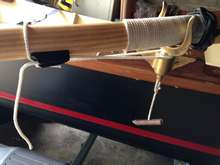 I cut the handles off, square to the end of the loom. I then tapered (8:1) both sides of the loom to a knife edge (parallel to the lamination joint for the oar blank) on the table saw, creating a 'V'. I then cut four 12" lengths of 1.5" by 3/4" oak, tapered (identical 8:1) each on one 1.5" side. Using TB3, glued the two pieces of oak (tapered side to tapered side) and then, at the same time, glued the resulting 'hollow' V over the taper on the loom. clamped and let it dry overnight.