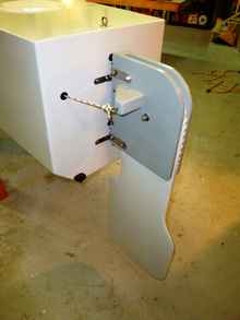 One aspect of this trimaran design that is (as far as I know) unique, is that it has a sliding “main” seat that allows the boat to be perfectly balanced whether sailing solo or with a friend. This was not the easiest thing in a boat with foot-pedal steering, so I had to devise a sliding seat on a track that also included the steering pedals.