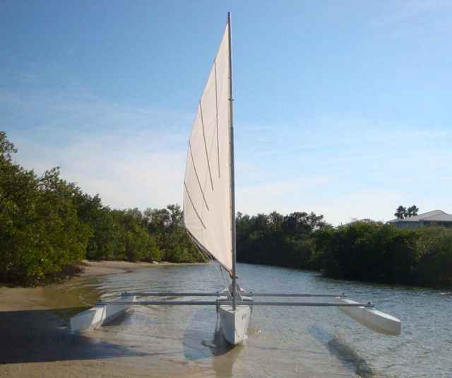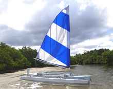 So there you have it: One boat that seats two, has three hulls, and has had four different sail rigs. In the end, the blue and white sail won out. It’s easy enough to reef if the wind picks up, but also a great performer in light air. Rigging is quick and easy, and sailing is an absolute blast!
