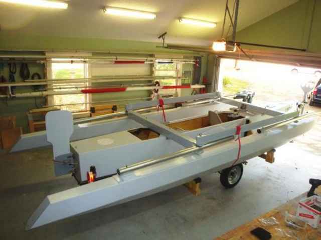 All of this brings me to introduce to you my latest trimaran creation: a 19-footer with a 14’ maximum beam and 18’ outriggers, or “amas” (as we trimariners like to call them). Here are a few late-stage construction photos that show just how lightly built this boat is.