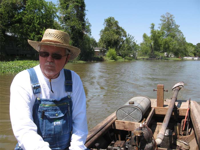 The drive from central Texas to Southwestern Louisiana was a little interesting, due to continual rain starting near the border and followed by trailer problems. I'm not sure that trailering is ever a problem in good weather. When I stopped for supper at a large gas station/truck stop about 30 miles West of Lafayette, Louisiana, a routine check of the boat showed that it had moved forward on the trailer with the bow stem ahead of the bow roller. The problem turned out to be two fold, first my use of a separate tie down on each side of the stern allowed too much movement and second the rubber bow roller was too flexible and allowed the stem to slip sideways. Trying to wrestle the 800 lbs of wayward boat back inline in the rain was starting to look futile when a truck pulled up and a most welcome voice said "Nice boat you have there". This was the beginning introduction to a long line of amazingly friendly and helpful people I met on this trip. Together we levered the boat back into proper position, swapped out the rubber bow roller for a plastic spare, and retied the stern ties. I spent the night at the truck stop rather than continue on in the rain and dark. Next morning, Friday, an early start put me into Franklin in time for lunch at the restaurant attached to the Best Western. I was in for another surprise here, this was not the usual motel restaurant—this place had really great food and excellent service! Franklin is a small town and the festival is held near the downtown area with easy parking and a short one block walk to a street adjacent to the Bayou Teche. There were about a dozen boats on trailers and sitting on the grass with another ten in the water a few steps away. One style of boat that caught my eye was a long flat bottom pram bow inboard. This turned out to be called a "Bayou Putt-Putt" and was a standard boat type for the Atchafalaya basin during the 1930s and 40s. Most of the restored models I saw were between 15 to 20 feet LOA, about 4 ft. beam with three bulkheads dividing the open cockpit, either a one or two cylinder, two stroke inboard motor, and built of cedar. These boats had no transmission and ran with straight exhaust, starting was simply spinning the heavy flywheel and shifting was done by momentarily changing the spark advance to reverse the motor. They were the universal boat for people living on the bayous and waterways of Southwest Louisana. These people, of mostly cajun ethnic background used the bayou putt putt for hunting, fishing, taking the kids to school, carrying supplies from town and carrying the family to church on sunday. I was invited for a ride on one of these restored boats by a man who inherited the boat from his father. The boat was over 70 years old, started easily and ran very smoothly with little wake.