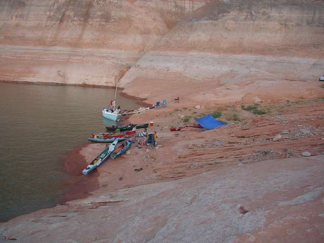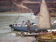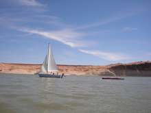 In my correspondence with Chuck about Lake Powell, he frequently mentioned that it was not a good lake to go sailing on. Tom Gale sailed in that first evening. In fact, the sailing was so good that he opted for a late supper to get in more sailing. As things turned out, Tom got to do a lot of sailing during this trip. He also brought a small sailboat and a double kayak, which the teenagers sailed and paddled around at various times during the trip. After we made camp, Tom sometimes took the little sailboat out for a while. He did have to run his outboard on the bigger sailboat to get where he was going for part of the trip. The group normally does this trip in September and there is usually not much wind that time of year (or so I’m told).