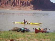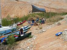 The second day brought us close to Forgotten Canyon. Tom Gale brought four teenagers in an eighteen foot sailboat with a small motor on the back. As we were paddling along he cruised on ahead to scout for good camping spots. This was the norm for the trip. Finding a spot that second night proved difficult though, all the good spots were taken by houseboats. We spent a lot of time just sitting in our boats in the shade close to the canyon wall. Someone joked that it was like we were in Waterworld because we couldn’t get out of our boats. Eventually we found a small area where we could get out and stretch our legs while Tom continued searching for a good camping spot for the night.