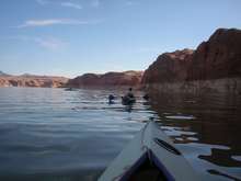 This is a shot of a couple of the kayaks ahead of us and part of the canyon walls. I like this photo because it gives an idea of the scale of the canyon walls and the lake. |