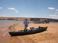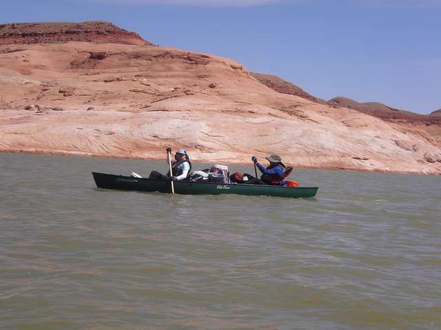 Chuck Leinweber invited me to join a group of folks at Lake Powell in June. This messabout has been going on for years and is commonly referred to as the Kokopelli cruise. I planned on getting my Michalak designed shantyboat, “Shanteuse”, finished in time for the messabout, but was unable to complete it by then. So I purchased a canoe a couple of weeks before the trip, and my daughter Cathy joined me for the adventure. I was nervous about the trip as I had not paddled a canoe in years; and that only for a brief hour on a secluded creek. Capsizing the canoe during the trip was my biggest concern, but we never did.