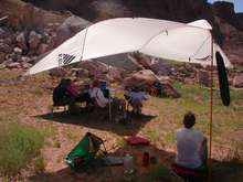One thing we came to appreciate very much while on this trip was shade. Both Kim and Chuck had shade sails that could be set up with some poles. Even a little shade was a welcome luxury in the hot sun. The wind didn’t always cooperate with us when we were trying to get the shade set up. Sometimes it took several of us to hang onto lines and poles while others would drive in the stakes and tension the lines. This frequently involved bringing big rocks over to hold down the lines. It didn’t take long after they were set up for several of us to be underneath them, trying to get out of the sun. The Leinwebers also brought umbrellas with them which they frequently opened up while they were paddling along. I was kicking myself for not thinking far enough ahead to bring umbrellas for me and my daughter. Of course I’m not sure where we would have packed them on the canoe.