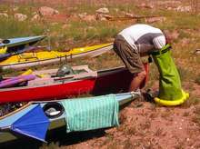 Then something unexpected happened. With nothing else to do for awhile, I put on hiking shoes instead of my usual sandals, and went for a walk up the canyon which emptied into the lake. After only a short distance, I spotted something that didn't belong there: a kayak paddle, standing upright on a rock outcropping, with a strip of cloth attached, waving in the breeze, like a marker or beacon. I approached it for a closer look, and heard a voice speaking to me from a rock shelter nearby. It was a guy who had been marooned there for about a week without food. He said he was paddling a kayak south, like us, and had come ashore, like us, to wait out a headwind. He walked up the canyon to explore, and when he returned, his kayak was gone. We fed him and used the VHF radio to summon help, including Park Service rangers, to get him out via power boat, since we were wind bound. Perhaps it's not fashionable to say such things anymore, but I feel certain that we were led to him by Divine Providence.