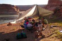 Day 4. The canyon walls that surround Lake Powell sometimes come to the water's edge, meaning that suitable campsites can be a challenge to find, particularly for a party of 12. When the main channel of the lake has no campsites to offer, side canyons may have better options. This day the main channel passed through five miles of steep, meandering canyon with no side canyons, no campsites, and no refuge should the wind get strong. The prevailing breeze was from the south, but no matter which direction the channel turned, the wind was always "on the nose." Fortunately the breeze remained moderate. We put the sheer canyon section behind us, and turned off the main channel into Cedar Canyon for a lunch stop and some shade. The heat, the wind forecast, and the attractive location turned our lunch stop into an overnight campsite.