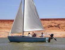 Lake Powell is a reservoir of the Colorado River, extending 150 miles across Utah and Arizona. The lake and its environs are also known as Glen Canyon National Recreation Area, managed by the National Park Service, but with less strict protections than those afforded to the National Parks. The lake is named for Major John Wesley Powell, a one-armed Civil War veteran who in 1869 led the first party to descend the Colorado River through what was then the last "terra incognita" in America. Part of his path down the river is now dammed, forming Lake Powell. The lake still lies at the center of a vast area of sparsely populated desert, canyons, and mountains. It's not on the way to anywhere. It's a day's travel from Phoenix, Las Vegas or Salt Lake City. You have to really want to go there to get there. Over the lake's broad expanse, there are only three widespread points of public access. The rest is a rocky, canyon-carved wilderness. To some, this kind of landscape is unlovable, and the last place they would choose to go cruising. Yet many love Lake Powell for its raw, primitive character.