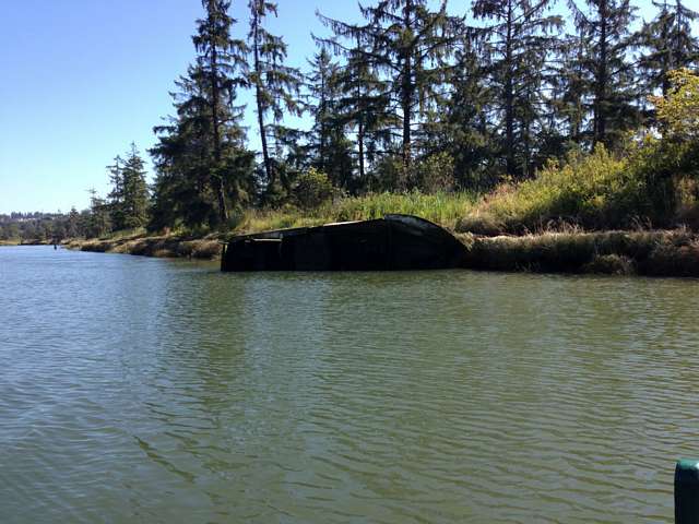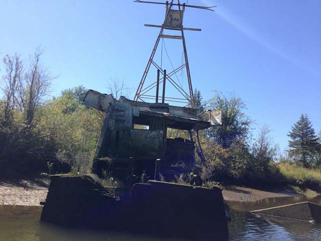 This old fishing boat showed up about 5 years ago or so. She was floated here, and will never float again. The metal bits will be here till the next ice age.