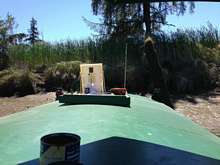 For lunch on day two I tied up to a piling, Mediterranean style, one end tied to the piling and the other held in place with an anchor. The helps keep the solar oven lined up. You can't really step out on shore, as the mud is very deep. You can only get out at high tide, when you can step onto the grasses.