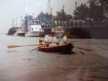 Two of the rowers from the death row rowing and me steering as we pass the Newburyport MA board walk in a borrowed swampscot dory. |
