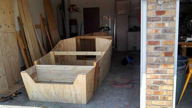 Interior panels are all fully glassed and filleted. Next boat project will use better plywood that doesn't require fiberglass on interior panels. Cabin decks and slot-top beams are roughed on. |
