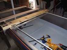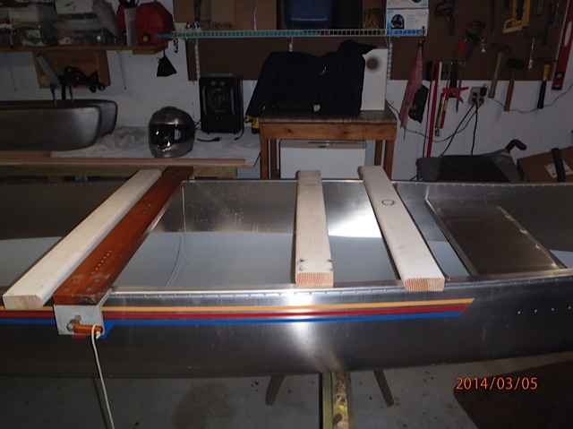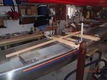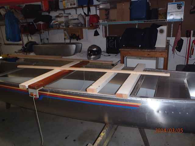 I've been going through a number of mockups in an attempt to determine just exactly how this all goes together. There are some basic guidelines to follow, keeping the leeboards close to the forward center of the canoe, determining the center of effort (CE) of the particular sail you're using, the CE basically determines the location of the mast/sail. There are other details concerning the mast step, on the older Grummans they came with two step tabs riveted to the keel. These were essentially based on the lateen and gunter rigs Grumman sold. The newer Grummans' don't have these tabs, nor does Grumman offer sailing options any longer (not since 1990). However, the tab is relatively easy to have fabricated and an appropriate mast step to mount on this tab. I'll go into more detail about the mast step once I get to the fabricator and have one made. Materials for the thwarts are not difficult to find, and there are many options. I started with 1x4 and 1x6 oak, but have switched to spruce particularly for the leeboard thwart. The leeboard thwart will have a lot of stress on it, so it's important to have a strong structure. It's also important to design the leeboard thwart so it can be moved for adjusting balance. It doesn't have to move very much, 3 or 4 inches is usually sufficient. I'm using metal home made clamps that came with the Grumman lateen sailing components I purchased used. The mast thwart can also be clamped on, but I will mount mine to the railings, thru bolting. I'm using stainless steel fasteners and aluminum or bronze parts to avoid corrosion issues. I'll make comments on each photo: