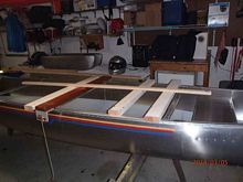 Using a wood mast step and a 1 1/2" PVC pipe for aligning, you can see the thwart placement. There is another option for the mast step, removing six keel rivets and having a step fabricated to bolt in place. The advantage of using a bolt in step is it can be removed and/or relocated by removing rivets and thru-bolting to the keel. The obvious disadvantage of marietexing the step in place, it's extremely difficult to remove. I'm undecided which I want to use. The mast thwart is 1x4 oak, although I have a section of 2x6 spruce which would match the leeboard thwart. The 1x4 oak middle board represents the location of the pontoon strut.