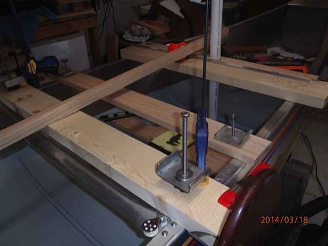 This is the oak 1x4 strut for attaching my two pontoons (I call them toons for short). I originally planned to use two struts, but the toons only weigh 11lbs each and a single strut should be strong enough. For good measure I will add a 1x2 screwed and epoxied strong back to this strut. The measurement of 5 inches is the distance forward of the leeboards this strut will be located (thru bolted to the railing). We need 5 inches clearance for the leeboards to rotate up and down.