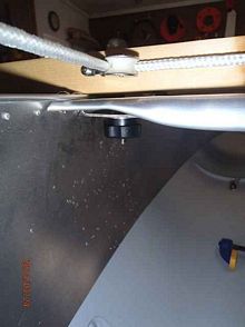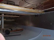 Leeboards will be centered on the hull, the white board represents the aft pontoon strut, the forward strut is just visible. There is room to install a thwart for a mizzen, which I'm still contemplating. I have two bermuda sails I could install and/or use the Sherpa lug with the bermuda mizzen.