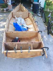 The build consumed about two gallons of low viscosity, slow hardening epoxy, which was the biggest materials cost (beside the trailer and sail). I have covered all surfaces with at least a light coating of epoxy, and the bottom is sheathed in 6oz glass cloth. She is painted with latex primer and porch paint. I used Titebond III in several places including the mast and spars. Anywhere likely to stay wet was thoroughly sealed with epoxy, some leftover CPES and 5200.
