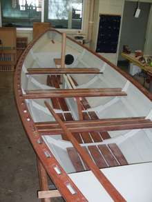 Lillistones’ latest design is Nugget (latest as still in a developmental stage) and is coming together nicely. This is a 15½ ft seven strake rowing hull not listed yet but maybe soon for lake and river conditions, with a truly beautiful under water hull form. My students are really being pushed with this construction (hey, there are 14 strakes needed you know) but they do appreciate the lovely lines with this build. Expected launch is November this year.