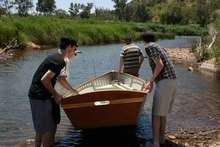 Meg, Alby. Two Mile Waterhole to the west of Alice Springs, with Alby right on the design waterline. The build crew all had fun out on the water. |