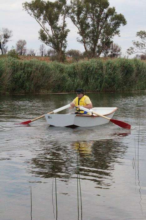 Giselle is a GIS by Michael Storer and is simple to construct; a beautiful 15½ft “Flat Iron Skiff”. There are several good GIS photo build blogs on the web. She was christened at Glen Helen Gorge in November 2011.