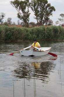The first design we constructed from Ross Lillistones’ portfolio was Alby. This pram SAG hull was easily constructed by my 6 students in their senior year. With a nice V hull form making her much quieter in the water than most tenders, she draws only 6”. Meg was launched at 2 Mile, Glen Helen NT in November 2012.