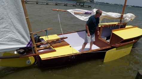 The build was straight forward and Jim's book, Boatbuilding For Beginners was helpful in understanding a few of the assembly steps and details. We built a scale model out of heavy paper to better understand the design, construction details and assembly sequence. During the construction of the model is when we decided to add the engine well which was not in the original plans. Jim has since added the engine to the design drawings. Rosa and I also used the model to try out different color schemes for the boat as well. I will bypass the details of building Hapscut and save that for another article, but will mention a few things. With the online forums I got plenty of help and it sure was nice to have a few sailors that had already built Michalak designs drop by and offer some on-site advice. Our biggest challenge was moving and rolling the hull during construction. We had one accident that scared and bruised Rosa when we lost control of the hull while rolling it over. After that we started to enlist the neighborhood teenagers to help move the boat after that. Six strong teenagers could carry the hull and roll it without difficulty.