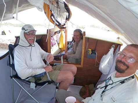 We have slept with three on board, two in the cockpit and one in the cabin without any problems. We have comfortably day sailed with as many as 5 people on board. Part of the versatility of Hapscut is the large open cockpit. We did not install the seats or rowing ports that are in the plans. Instead of the seats per the plans we modified some store bought stadium seats that hang on the gunnels by two large hooks that drop into the open wales. (The open wale design is not in the plans.) This allows us to move the seats to any place along the gunnel and to either side of the boat depending on sailing conditions or where the shade is. They can also be folded up so they are out of the way for moving around the cockpit, while docking or getting the cockpit ready for sleeping.