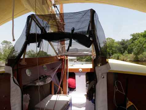 Like many builders of the walk-thru boats, we too scratched our heads on how to cover the walk-thru slot for rain and bug protection. On the Duckworks site I found an idea for using poly tarp material and pvc pipe to make a cover for the slot. This full length cover has a special slot in it for the mast and a boot to keep the water from running down the mast and into the boat. We use this cover for trailering and splash protection while sailing when lots of protection is needed, but most the time we use another short slot cover that covers from the mast forward to the front hatch. Taking this cover idea a little further I made a mosquito net that covers the slot and rises up at the cockpit end to make getting in and out of the cabin easier. We typically put up both the cockpit netting and the slot netting when camped since the porta-a-pottie is kept inside the cabin. For the cockpit mosquito protection we hang a store bought queen size bed bug net under the boom and/or sun shade and tie it off to the gunnels and a few pad-eyes. This bug net has a few modifications that include adding lead fishing weights to the corners and sides so it doesn't blow away and a few extra ties on the top for hanging from the boom. This provides enough head room for sitting and getting dressed.