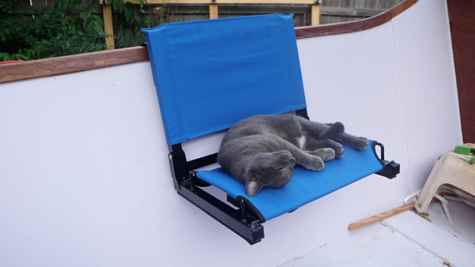 My daughter's cat, Hinata napping on her favorite spot. The folding stadium chairs hang on the gunnels by bent aluminum flat bars screwed to the back supports. |
