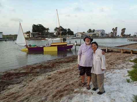 Rosa and John at Hap's Cut with Hapscut in the background. The mast warped during construction but gives the boat a zoomier look. We plan to build a new mast that will be straight and less flexible. Photo by: Stan Roberts |