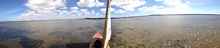 A couple of hours later I had reached the entrance to the lake which is guarded by a very shallow entrance of about 1 foot of water making access via the river impossible for most boats. The virtues of this little canoe where starting to reveal themselves to me. With a gentle but steady breeze I headed out across the lake into the rising sun only to strike the bottom right in the middle of the lake. After testing the stability of the bottom I got out to stretch my legs and survey my options.