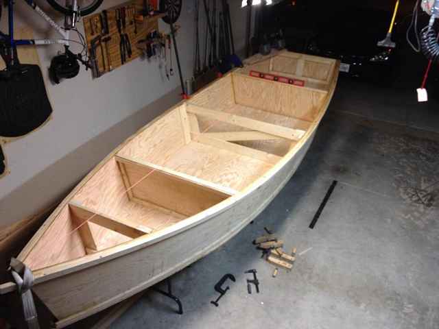 The boat was framed and needed a bottom. Instead of gluing the bottom on one piece at a time, I glue the three pieces of ½" marine plywood sheets together with two 1 x 4's. After a couple three days, I took the boat frame outside and laid the bottom over it, traced a generous line and cut it out. I screwed it down with regular drywall screws and let it set for a couple days so it could assume the rocker of the frame. Long story short, the glue went on and the screws were replaced with stainless steel exterior wood screws. I was done with the bottom!