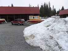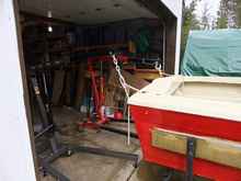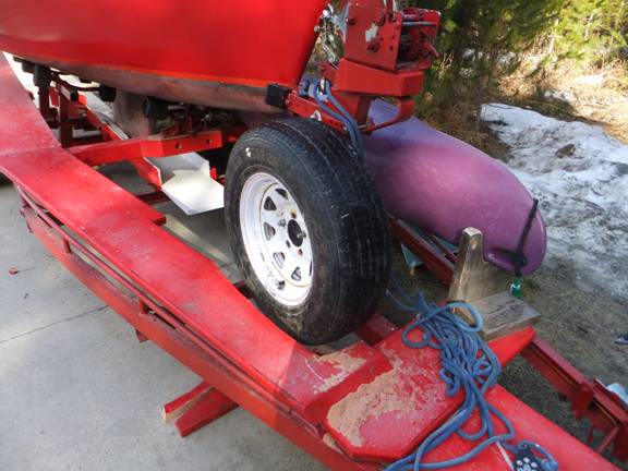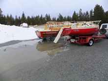 Somehow, I managed to break at least one of the casters under the building cradle. A set of heavy duty vehicle movers got plugged in, and she more or less was willing to roll from the nice warm shop out into a world still piled with snow. Some three-quarter inch anchor warps, two 4,000 pound mobile cranes, two floor jacks, and Little Alice, with her own trailer ball and hydraulic lift up forward persuaded the (much heavier than I have been assuming) boat to take this rather large leap of faith. And as a bit of reminder that we do in fact inhabit that frozen north netherworld here of Almostcanada. Float testing and engine mounting will have to wait for less-solid water at the launch ramp.