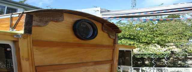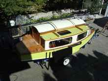 Nobody ever accused me of being a photographer. I haven't let that stop me and present here some snaps of my efforts this summer. The roof and hatches came first. They should have probably followed the tabernacle, not preceded it. However, I didn't plan on a tabernacle until the mast snapped, but that's another story. I'll get back to that later. The roof and hatches were constructed of cedar strips a la stripper canoe style with cove and bead edges. The hatches were constructed first as one large piece and then the roof section was built on top of it to get the mating curve. Next the hatch was cut into two equal length pieces. The hatches slide on aluminum angles fastened to the slot top rails. The roof is fastened with hooks on one side and loose pin hinges on the other rail. It is removable. The black coloured gaskets between the roof and the hatches were carefully designed by General Motors and came from a 2002 Oldsmobile that was languishing at Ralph's Pick-A-Part. They started life as weather strip around the doors and have proven to be effective on a boat as well.